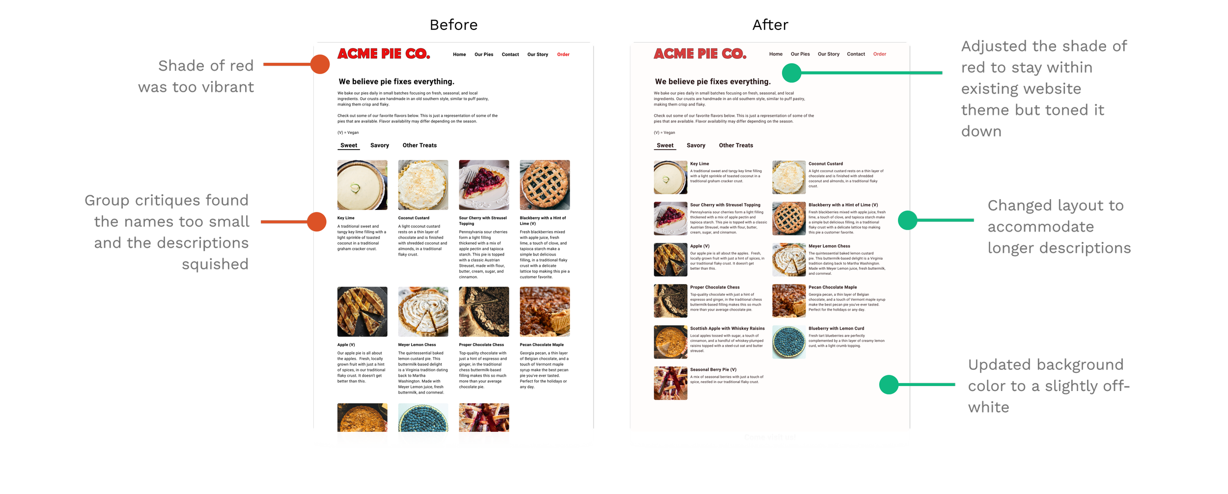 The current website lacks responsiveness and needs a more polished, user-friendly design. There are several URLs that are not properly linked, and the product information is presented in a somewhat cluttered manner. The site appears to have been built primarily to provide basic information rather than to function as an engaging, user-friendly platform for new visitors. From reviewing various articles about the shop, it's clear that the owner has traditionally relied on word of mouth—especially through restaurant sales of his pies—rather than focusing on retail. This is reflected in the website's minimalist layout, which features only basic information and a few enticing pie photos but lacks the functionality and organization needed to attract and serve new customers effectively.