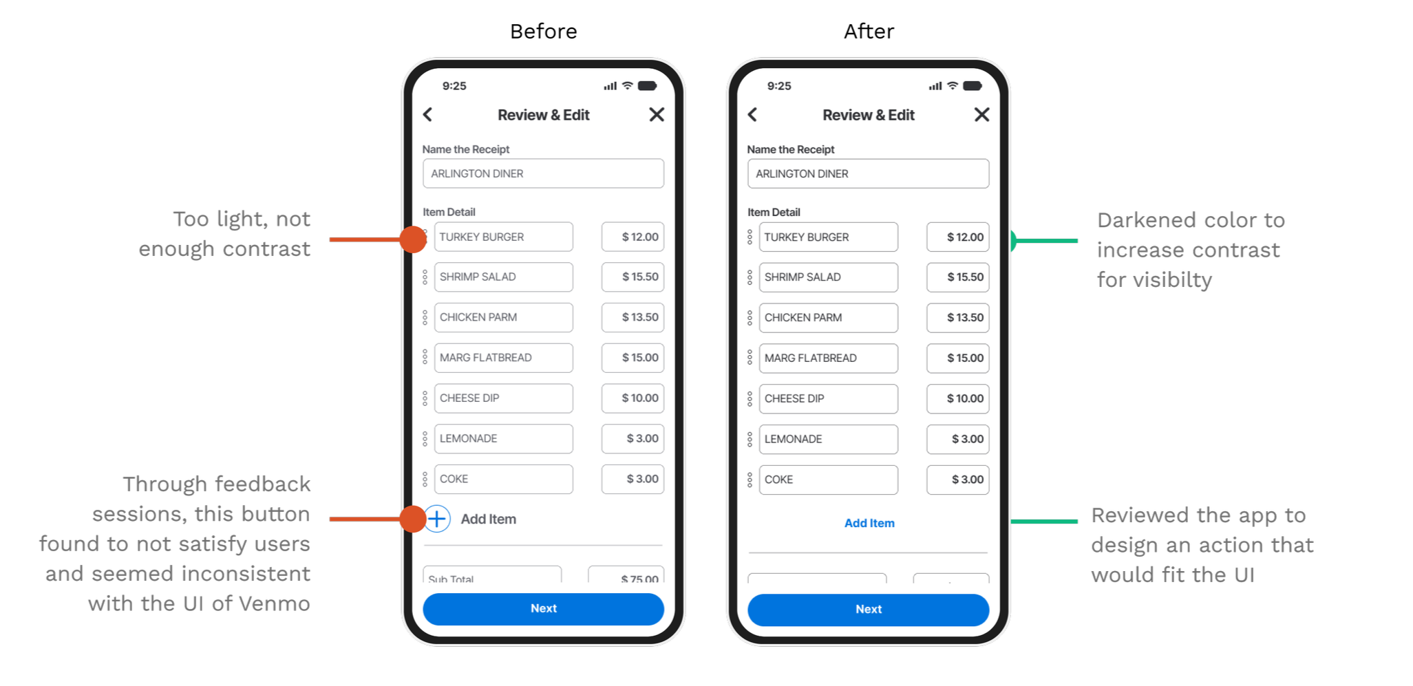 Interviews showed users were relying on avoided third-party apps to assist with calculations and then moving into Venmo to request the payment. Keeping the feature within Venmo streamlines the process, eliminating the need to switch apps.