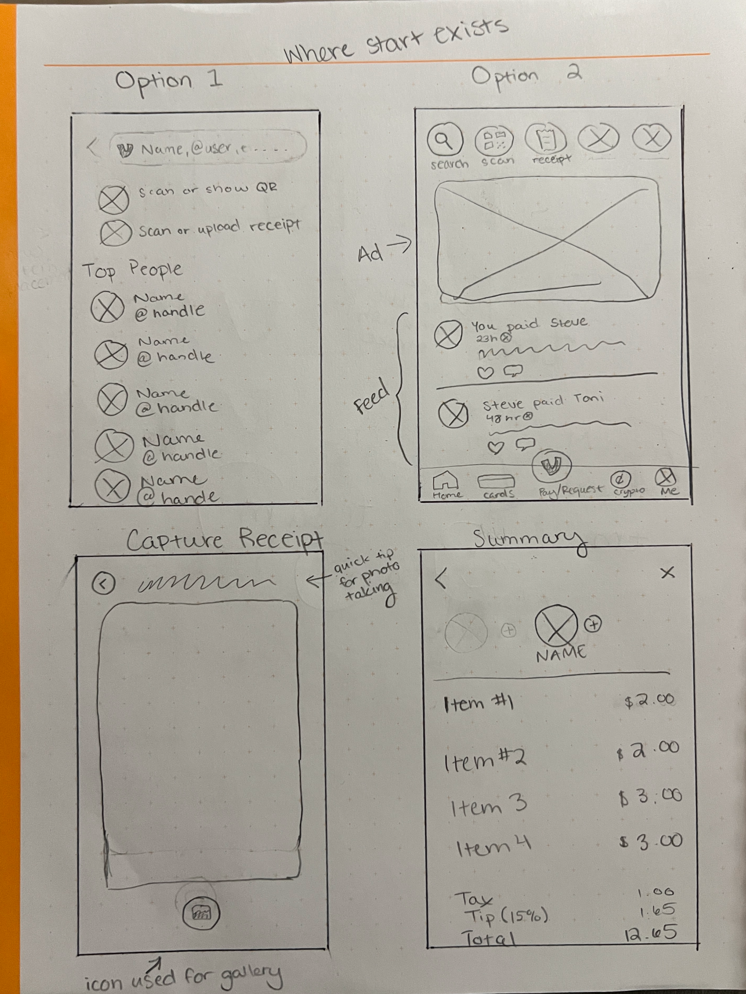I started by mapping out Venmo’s existing “Request Payment” user flow to find a natural entry point for receipt capture without disrupting familiar behavior. My goal was to weave the new feature into the app’s flow so users could capture, split, and request in one seamless process.