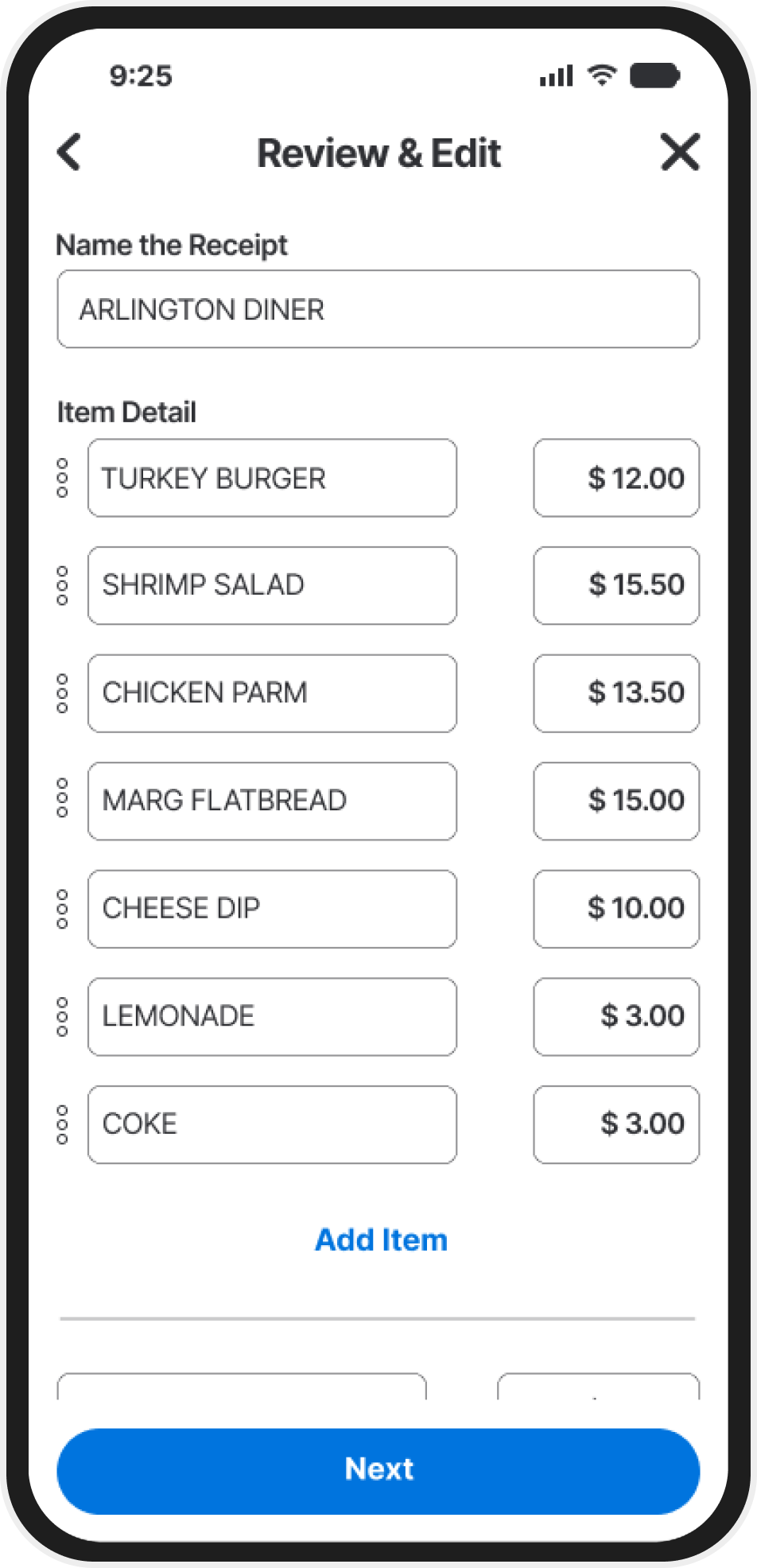 Users struggle with manual calculations, leading to errors. This feature scans a receipt and itemizes it for you, eliminating extra steps. If an amount is wrong, you are able to edit it.