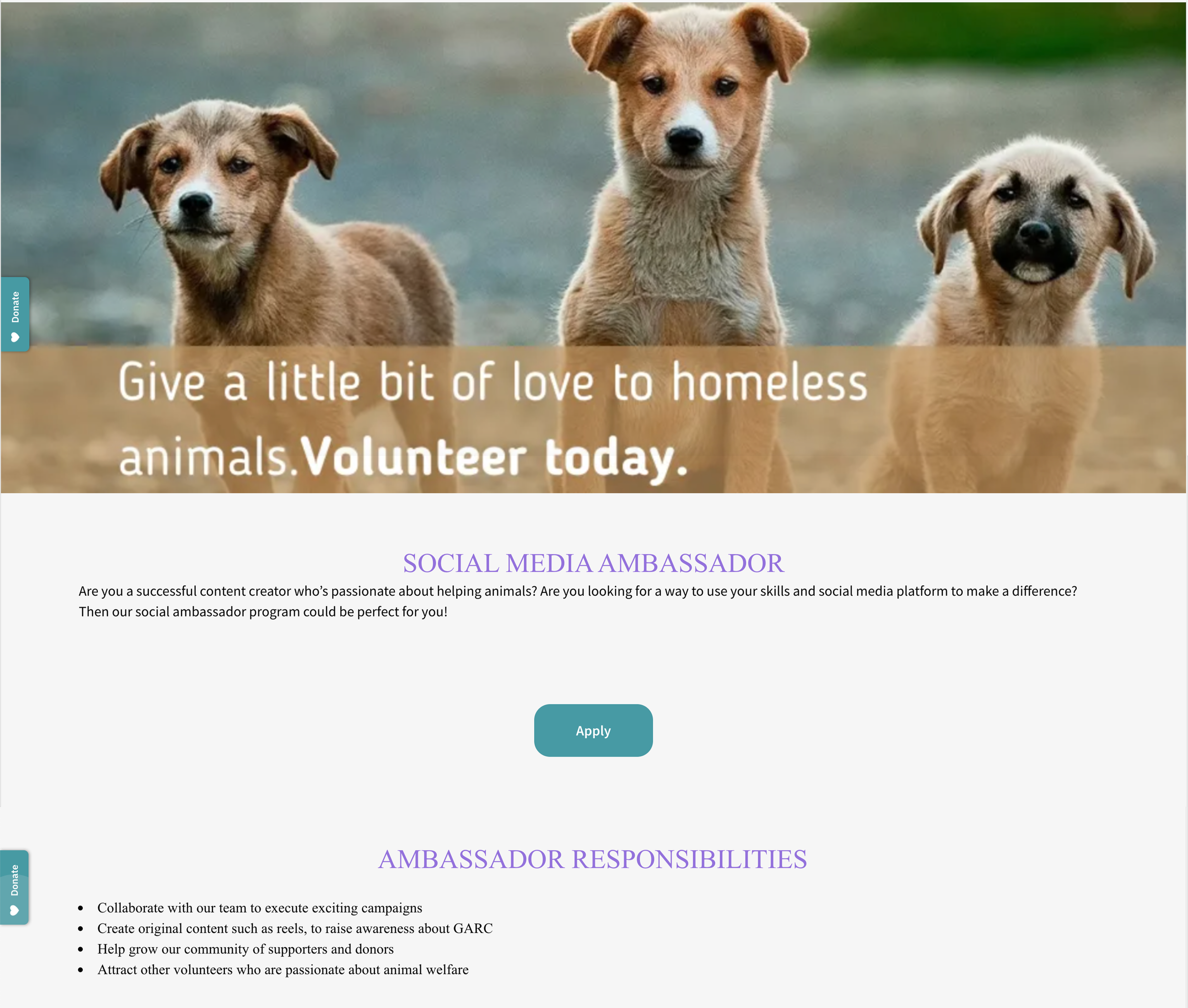 A non-profit Animal Shelter approached me to evaluate their existing website and improve their Social Media Ambassador page. This page is responsible for recruiting volunteers to help promote the shelter's animals online. The client needed an outside perspective to identify what wasn't working and a clear, actionable plan she and her team could realistically implement.